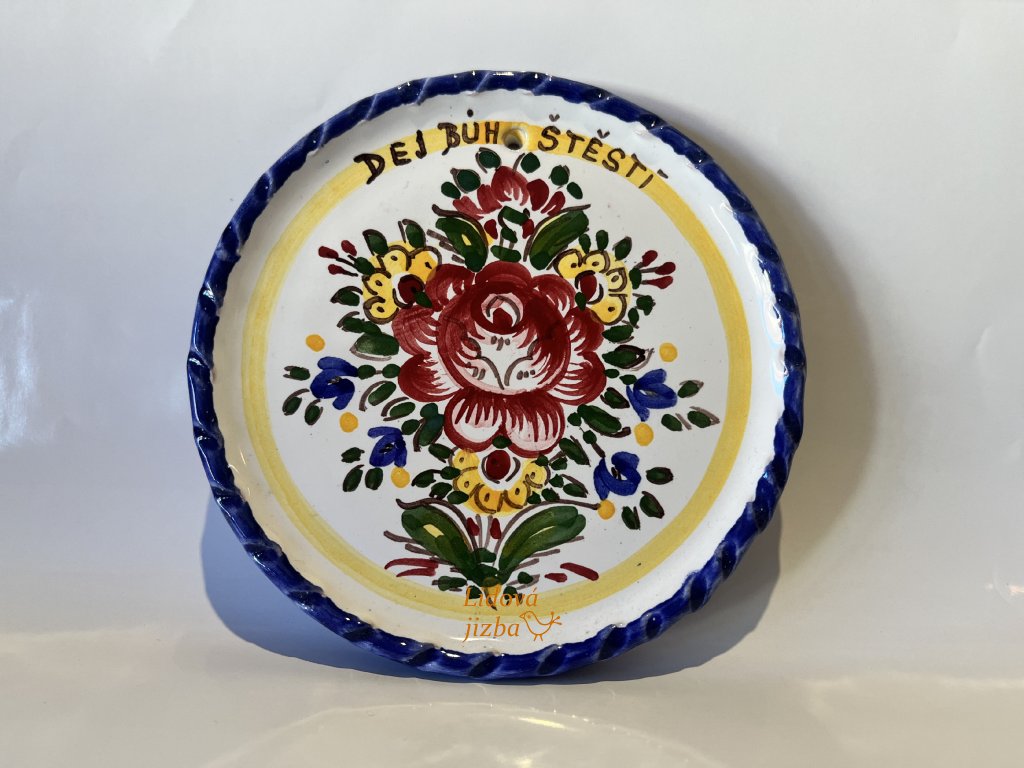 Ručně malovaná keramická ozdoba na zeď s nápisem: "Dej bůh štěstí"