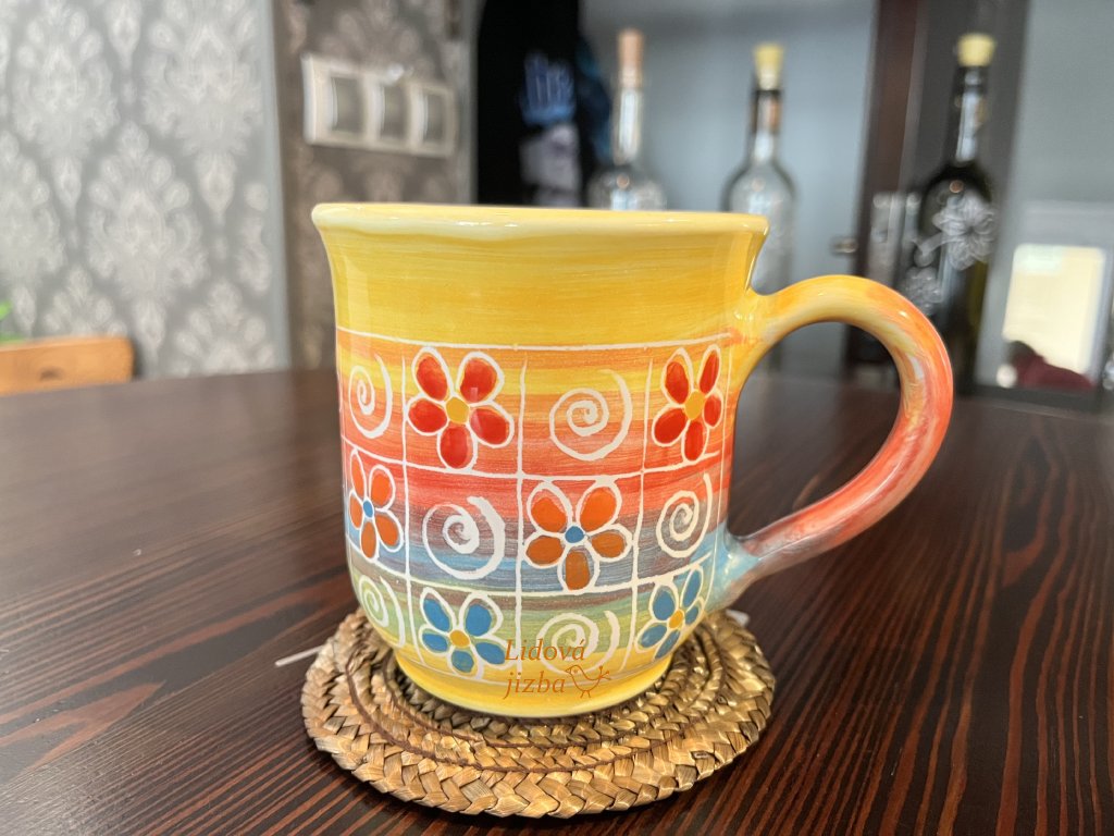 Originální hrnek s barevnými pruhy a motivem květin je výsledkem poctivé ruční práce. Každý kus je jedinečný – jemné odchylky v barvách a detailech jsou přirozeným znakem ruční výroby a dodávají hrnku osobitý charakter.