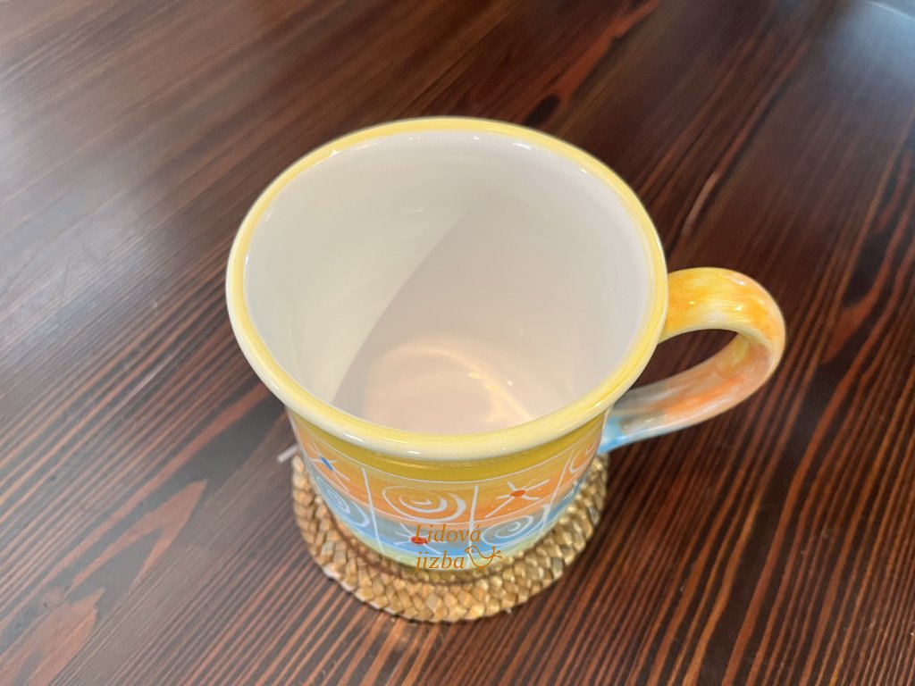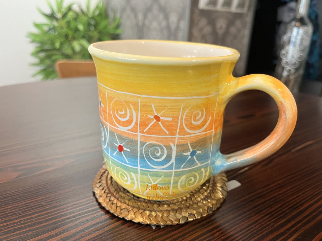 Originální hrnek v barevném provedení je výsledkem poctivé ruční práce. Každý kus je jedinečný – jemné odchylky v barvách a detailech jsou přirozeným znakem ruční výroby a dodávají hrnku osobitý charakter.