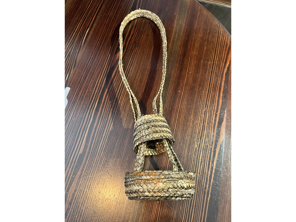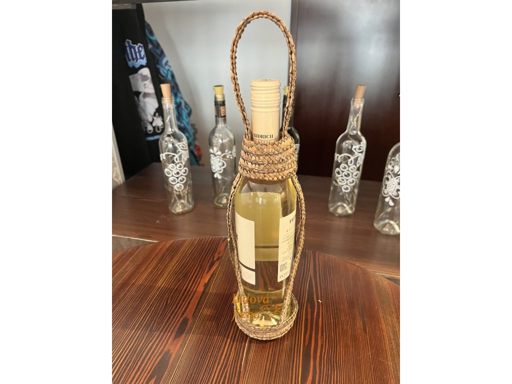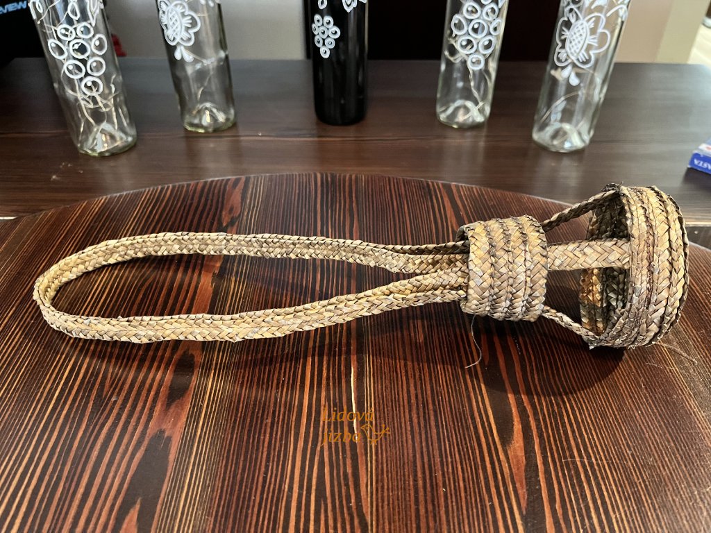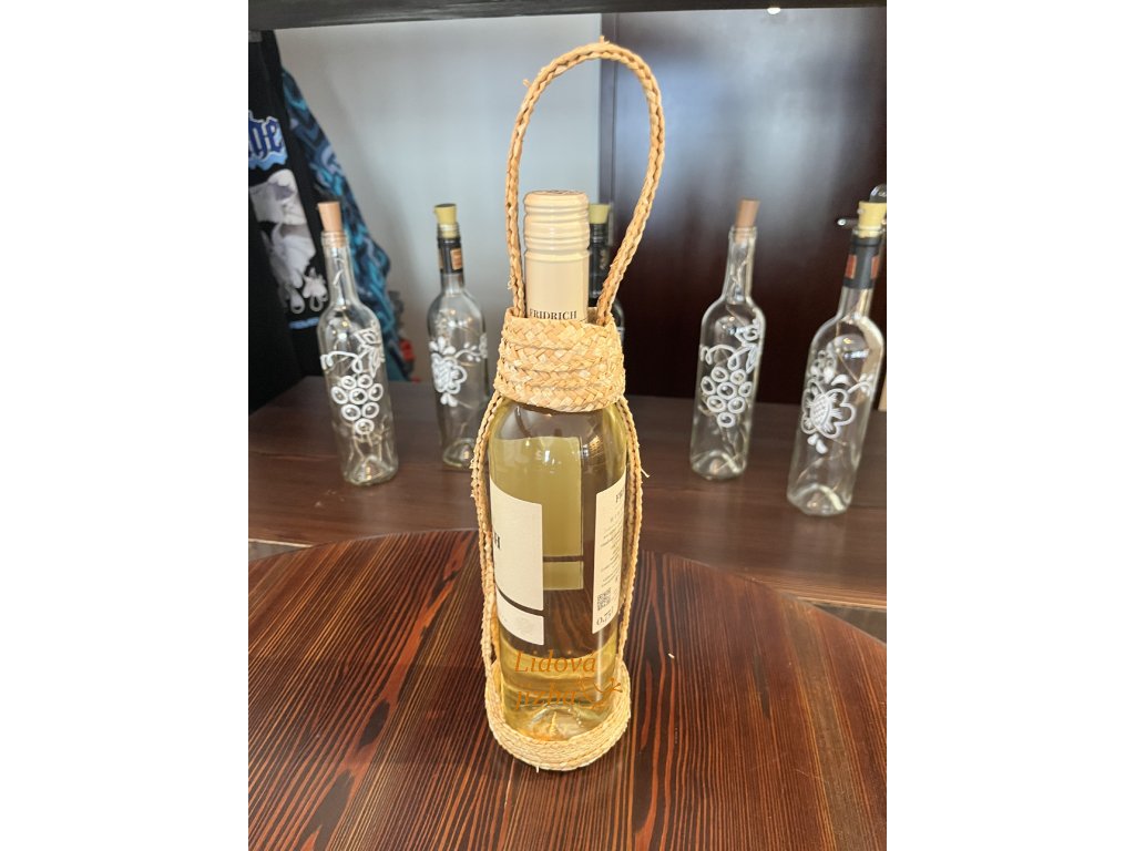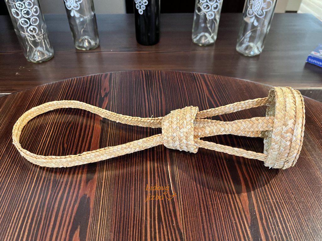 Materiál přírodní sláma. Nosič je vhodný doplněk na folklorní akce či průvody ale zároveň funkční věc na ulehčení přenosu láhví vína. Rozměr 38 x 9 cm.