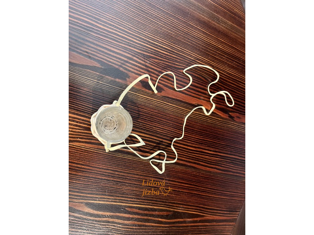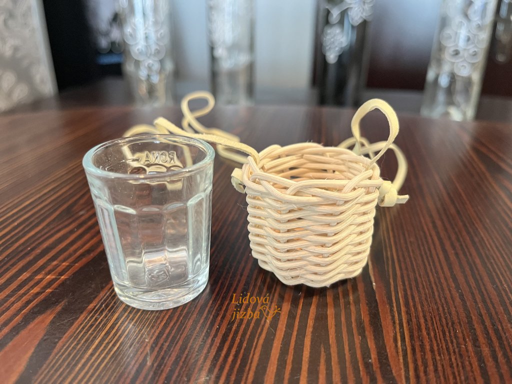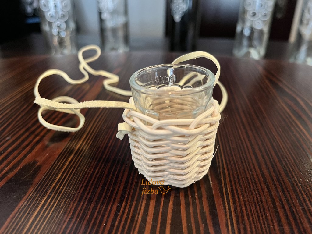 Opletená sklenička na alkohol se šnůrkou. Sklenička je součástí výrobku.